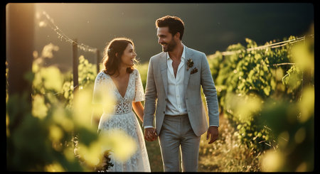 A smiling man and woman, dressed in formal wedding attire, stroll through a lush vineyard on a sunny day, surrounded by greenery and warm light.