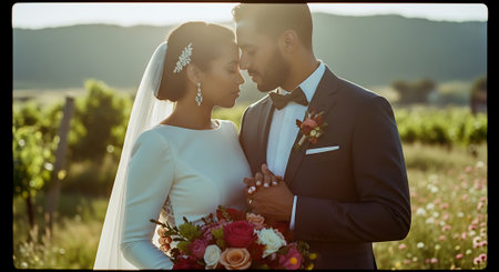 A tender moment between a bride and groom in a picturesque vineyard, surrounded by lush greenery and vibrant flowers, with the warm sunlight casting a romantic glow.