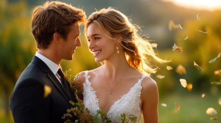 A newly married couple, a man in a black suit and a woman in a white gown, walk hand in hand. The scene evokes love, commitment, and celebration on their special day, with soft lighting and an intimate feel.