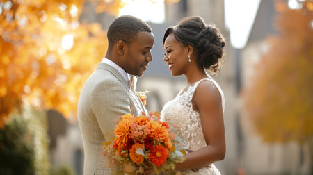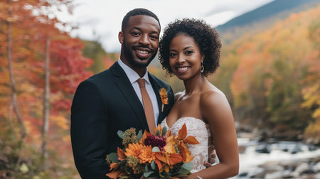 Autumn wedding day of beautiful young adult black couple, bride and groom in elegant festive clothes against fall yellow and crimson landscape outdoors, AI generated