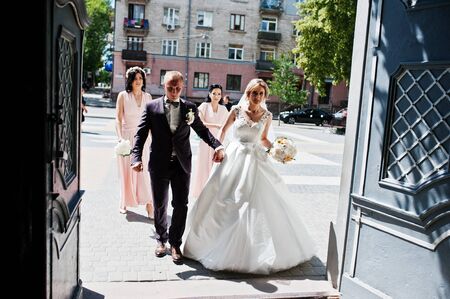 bridesmaid and groomsmen preparing wedding towel for stylish bride and groom in register office, wedding couple preparing for official wedding ceremony