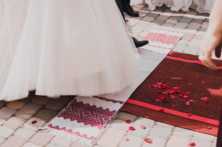 The bride and groom take a step on white national towels. Ukrainian national ornament embroidered.