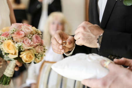 Romantic couple exchanging rings during wedding ceremony in church, handsome groom putting on wedding ring on beautiful bride's hand closeup
