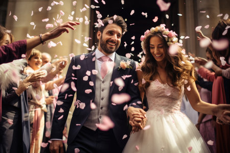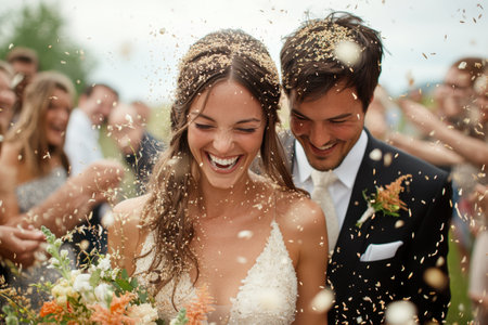 A joyful bride and groom celebrate their wedding surrounded by guests throwing petals, symbolizing love, happiness, and unity.