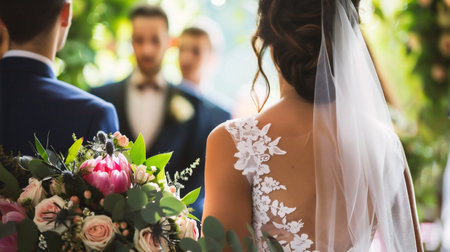 Wedding couple holding bouquet of flowers at the wedding ceremony