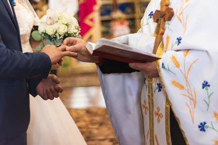 Priest blessing silver wedding rings on silk pillow with holy water for matrimony in church. Wedding spiritual ceremony. Wedding tradition