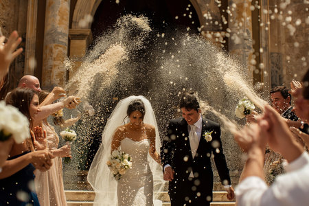 A joyful bride and groom walk out of the church, surrounded by confetti as they wave to their guests. The groom is dressed in an elegant gray suit with a black bow tie, while his wife wears a flowing white wedding dress adorned with delicate lace details. They both have big smiles on their faces as thousands of people clapping surround them. --ar 3:2 --v 6.1 Job ID: fa519e56-fe07-4cdd-85bb-df6423a61351