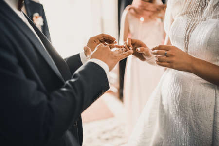 The bride and groom exchange rings. A man puts a wedding ring on a womans hand. The girl put ring on man.