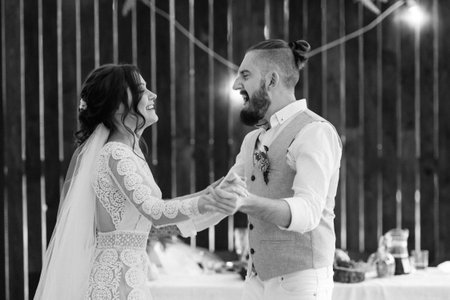 the first wedding dance of the bride and groom inside the restaurant hall in sunset light