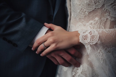 Capturing Eternal Love: Wedding Rings Graced by Bride and Groom's Intertwined Hands --ar 3:2