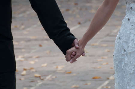 The bride and groom sit and gently stroke their hands to each other. Closeup of hands and wedding bouquet