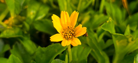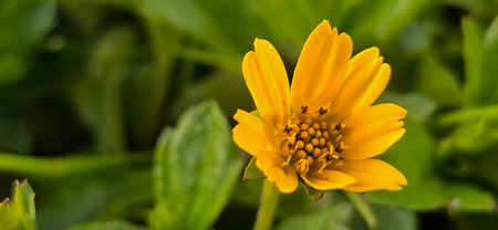 Yellow Wedelia flower Sphagneticola trilobata vibrant against green foliage. Perfect for nature, garden, or tropical themes.