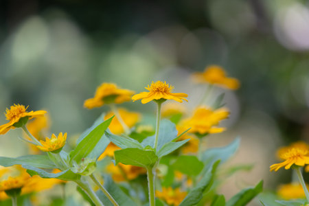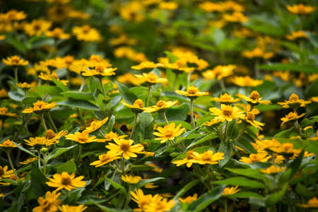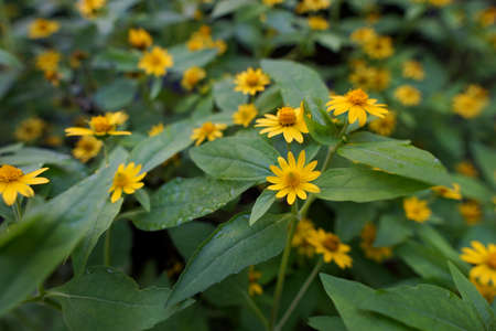 Melampodium Butter Daisy, mini sun flower, yellow flower Rudbeckia, Heliopsis helianthoides, blooming toward the sky, in shallow focus