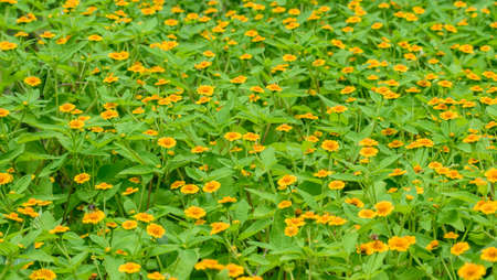 field of Singapore dailsy yellow flower blooming with green leaves