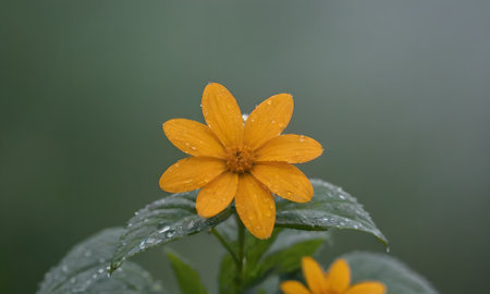 Beautiful yellow flower with water drops on the petals and leaves