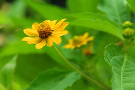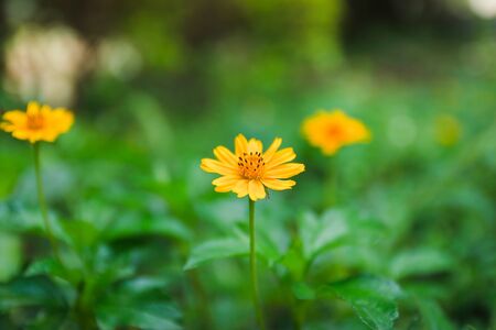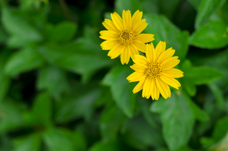 The yellow flower on green background. The yellow flower in the garden. These flower call Singapore daisy.
