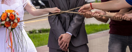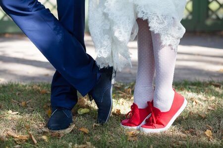 Bride in red shoes with lacing and stockings with a snow-white hem of a wedding dress on the grass. Legs of the groom in blue shoes and trousers.