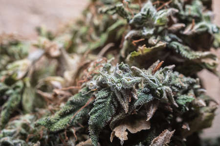grow and use of marijuana cbd thc medicinal. Concepts of legalizing herbs weed, Macro shot with sugar trichomes, buds grown cannabis in the house, Bud cannabis before harvest