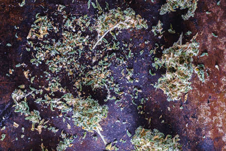medical cannabis buds are scattered randomly on a rusty metal surface. horizontal orientation.