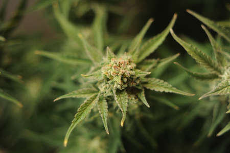 Flower bud of cannabis Satival in the greenhouse, marijuana flower bud background, herbal medicine. Concept of herbal alternative medicine, cbd hemp oil.