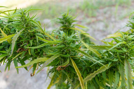 Growing Cannabis Sativa outdoors. Medical marijuana cultivation. Alternative herbal medicine, marijuana legalization. Cannabis farm
