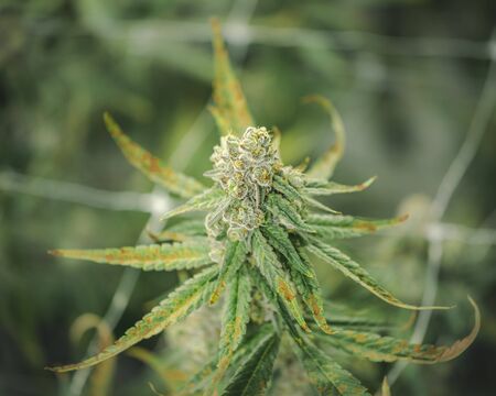 CBD cannabis flowers with leafs just before harvest.