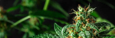 Cannabis plants in bloom panorama with white and yellow flowers, with trichomes. Cultivating medicinal marijuana
