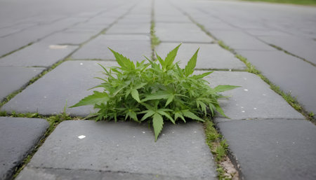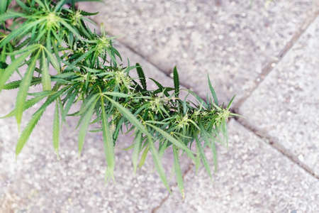 Branch of hemp with leaves, buds and blossoms on a concrete pavement tiles. Close up.