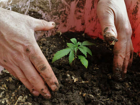 dirty hands of a farmer planting a small sprout of cannabis in a large bucket with fertilized soil, planting marijuana seedlings with male hands in a plastic container from the ground