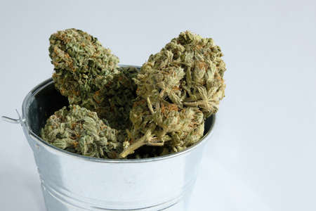 Dry cannabis, marijuana blooms in a bucket on white background. Big hemp buds in a pail, macro view. harvest concept