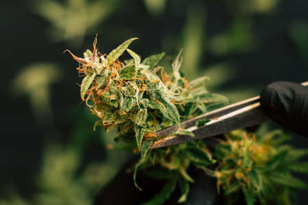 A Scientist holds a cannabis cone in her hand and cuts it with secateurs, Trimming cannabis sativa to planning. alternative medicine concept.