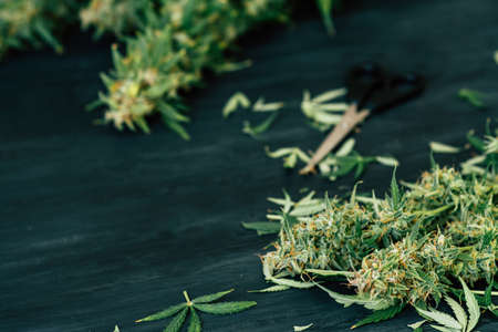 Harvest of marijuana. Trimming process. Man hand with cannabis and copy space.