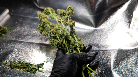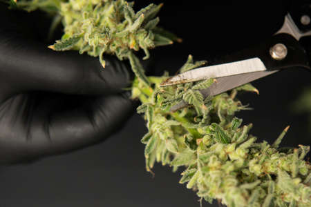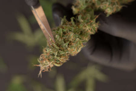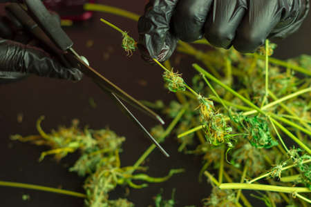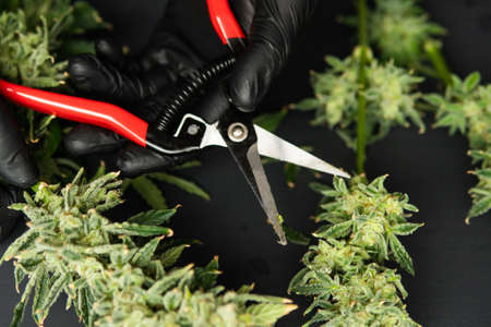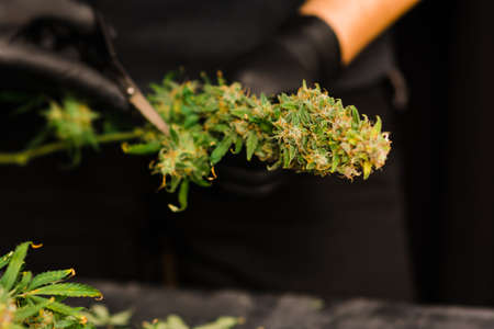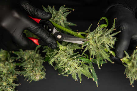 Cropped Hands in black gloves trimming medical Cannabis Marijuana buds prepare for drying