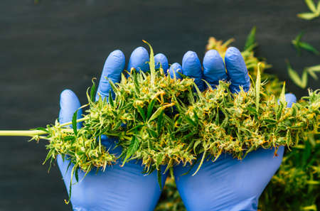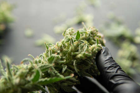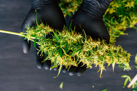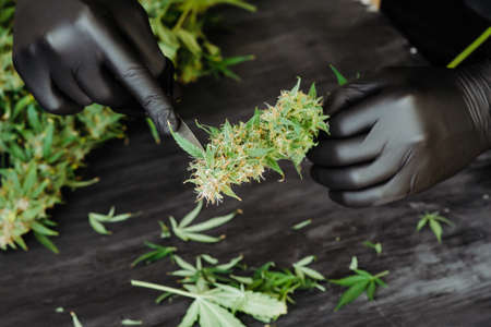 The person in the black gloves are trimming medical marijuana buds. Fresh harvest of cannabis plant. Cannabis is a concept of herbal medicine