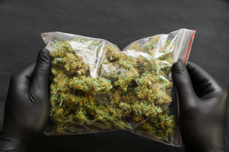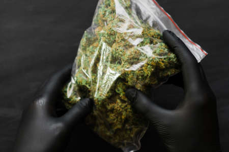 Package zip lock with cannabis buds. Street drug business. Illegal marijuana selling. Criminal weed concept.