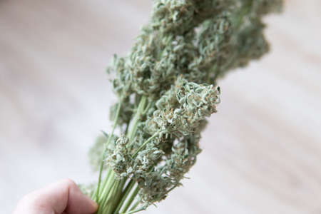 A large number of cannabis flowers the hands of Medetsinsky employee concepts of profuse cultivation