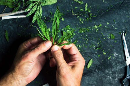 A man is cutting fresh cannabis buds. Vintage marijuana