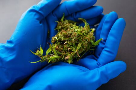 medical marijuana in the hands of a doctor in blue medical gloves. cannabis buds in the hands of a general practitioner close up