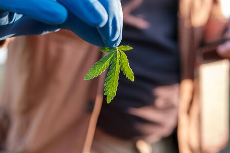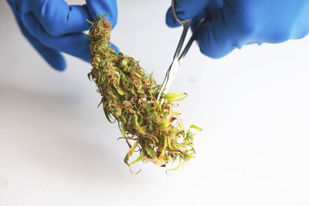 close up of cannabis leafs and narcotic bud being checked by human hand wearing medicinal gloves.
