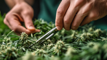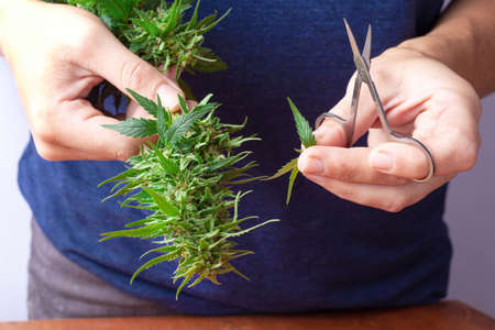 cutting leaves from buds of marijuana, trimming cannabis plant