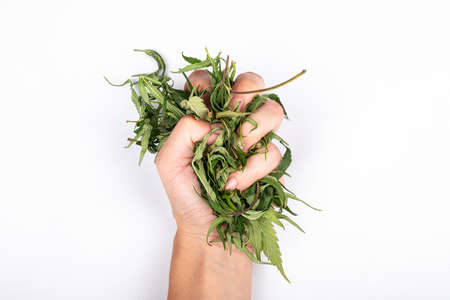 marijuana leaves in woman hand on white background, cannabis legalization symbol
