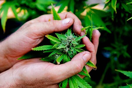 Cannabis plant bud in hand close up. Farmer examination marijuana (Cannabis sativa) flowering cannabis plant and bud, alternative herbal medicine concept
