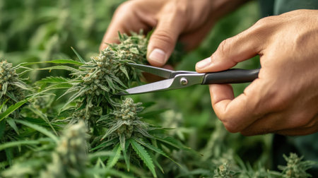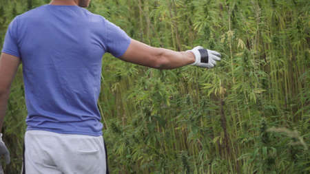 hemp plants CBD oil production. cannabis plants in farm field. worker removing leaves from twig