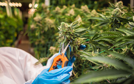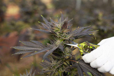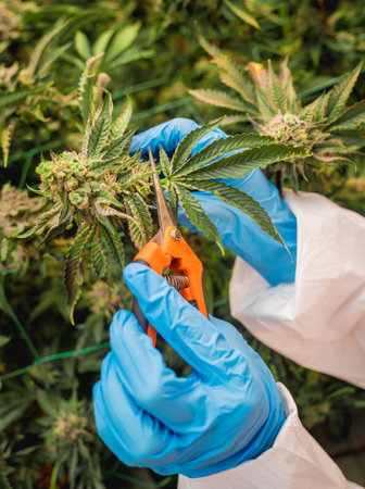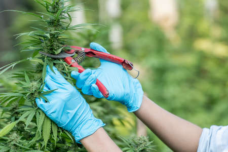 The expert scientist with gloves tree pruning cannabis plants in a greenhouse. Concept of herbal alternative medicine, cbd oil, pharmaceptical industry cure various diseases.