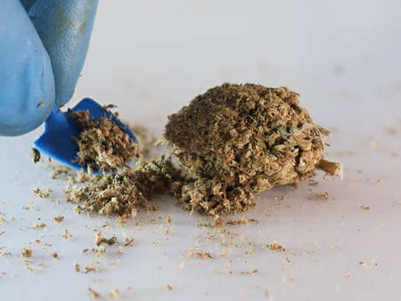 Illegal pruning of cannabis kidneys in the US by migrants from other countries.trimming marijuana buds with scissors in blue gloves on a white background