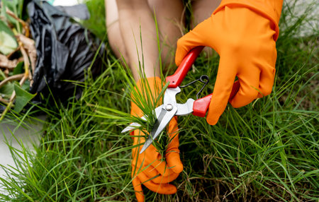 Woman in working gloves, woman mowing grass, woman pulling grass, season, summer, summer residence.