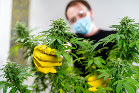 Growing medical marijuana. Man in a mask and gloves checks a cannabis plant
