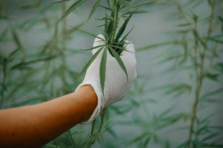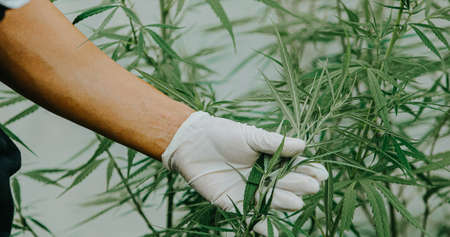 The expert scientist with gloves checking cannabis plants in a greenhouse. Concept of herbal alternative medicine, cbd oil, pharmaceptical industry cure various diseases.