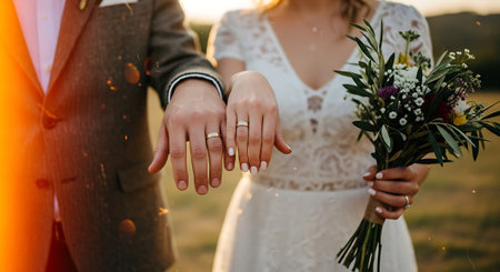 A tender moment of a newlywed couple holding hands, with the bride in a white wedding dress and the groom in a suit, set against a serene green field and sunset background.