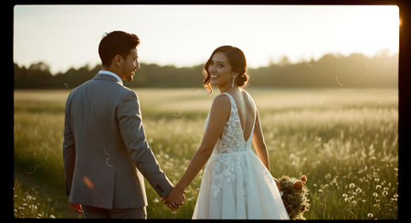 A newly married couple, a man in a black suit and a woman in a white gown, walk hand in hand. The scene evokes love, commitment, and celebration on their special day, with soft lighting and an intimate feel.